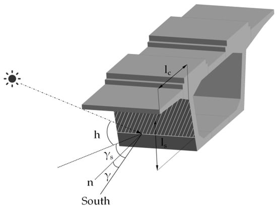 As shown in Figure 2, indicates the cantilever width, indicates the azimuthal angle normal to the outside of the web, and are the solar azimuthal and altitude angles, respectively. According to the geometric relationship shown in the figure, calculating the shaded length of the web can be obtained by Equation (20).
