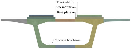 The CRTS II slab ballastless track on a bridge is composed of main beam, base plate, CA mortar, and track slab. As shown in Figure 3, considering the influence of the connection between the track slabs on temperature, the model of three track slab lengths was established by ANSYS. Table 1 shows the structure dimensions and calculation parameters.