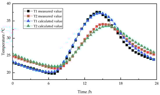 The environmental parameters from the literature [26] were substituted to verify the calculation accuracy of the finite element model; the comparison between the calculated results and the measured data is shown in Figure 4. The measured data are the continuous monitoring results of two temperature measuring points on ballastless track (28° N, 113° E). The calculated temperature time is 5 October 2013, and the highest and lowest temperatures are 27.6 °C and 18.1 °C. The numerical simulation results are essentially consistent with the measured data, with good agreement and slight errors. The results showed that the finite element simulation of the temperature field was reliable.