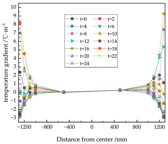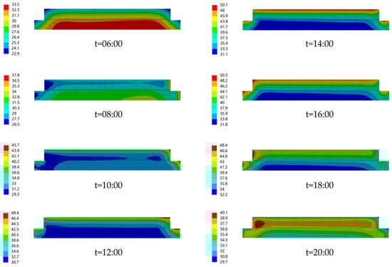 Figure 12 shows the daily distribution curve of the transverse temperature gradient after using the coating. Compared with Figure 7b, it can be seen that the reflective coating reduces the transverse temperature of the plate. The maximum negative temperature decreased from −5.47 °C to −2.91 °C. The maximum transverse temperature was reduced from −5.47 °C to −2.91 °C, and the maximum positive temperature was reduced from 10.29 °C to 9.27 °C. Therefore, the reflective coatings do not change the transverse temperature significantly.