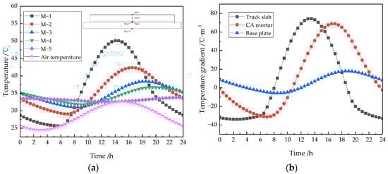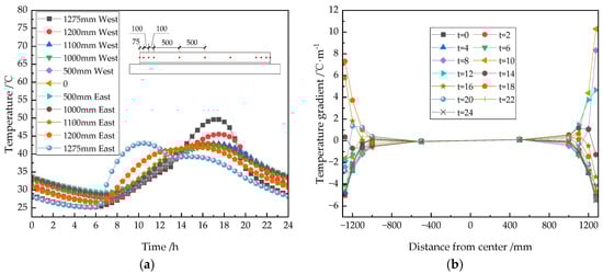 The results in Figure 7b show that the transverse temperature varies significantly within the 200 mm range on both sides of the track slab. In other areas, the temperature changes are relatively flat. For example, the daily temperature gradient within 200 mm from the east and west sides is −5.47~10.29 °C/m, and the range of temperature variation on the east side is slightly larger than that on the west side. The daily temperature gradient in the range of 1000 mm from the center is only −0.56~0.54 °C/m. The vertical temperature gradient is relatively tiny, and the highest vertical temperature gradient is 7.24 times the highest transverse temperature gradient.