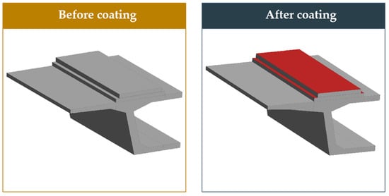 The main source of heat for a ballastless track is solar radiation, so this paper takes reflective coating as an example to study the temperature effect of a cooling coating on the structure of ballastless track. The radiation that shines onto the surface of the track structure is partly reflected and partly absorbed. The radiation absorption coefficient of an ordinary ballastless track surface is about 0.65. The reflective coating has a strong reflective ability against radiation, according to the literature [28]; its reflectivity is greater than or equal to 0.8, and its absorption coefficient is less than 0.2. However, due to the influence of construction conditions, concrete property differences, atmospheric oxidation, and ultraviolet aging, the reflective ability and radiation emission ability of the coating are weakened. In this paper, the reflective coating parameters determined by Kang Weixin [29] by back-calculation through tests are referred to; the solar radiation absorption coefficient of the coatings was 0.37 and the blackness coefficient was 0.82. The thickness of the reflective coatings was thin, so it was ignored in the modeling. The radiation was multiplied by the corresponding absorption coefficient and added to the surface of the ballastless track as a heat flow density load in the calculation. The painting method is shown in Figure 8.