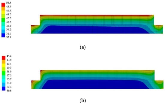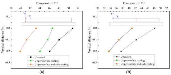 Cross-section temperature distribution at 15:00 (a) Without coating and (b) Coating on the upper surface.