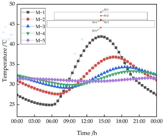 The application effect of the reflective coating was analyzed by the curves of the center temperature of the upper, middle, and lower surface of the track slab, the lower surface temperature of the CA mortar layer, and the base plate. The temperature variation curves for each depth of the track slab is shown in Figure 10.
