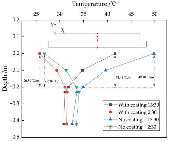 Vertical temperature distribution of ballastless track at typical moments before and after the use of coatings.