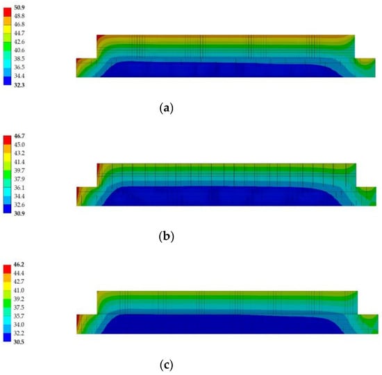 Cross-section of the temperature distribution at 16:00 (a) Without coating, (b) Coating on upper surface, and (c) Coating on upper surface and side.