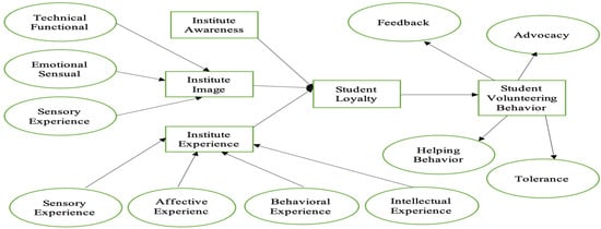 The customer experience with organizations, brands, and institutes was first introduced in the 19th century []. It was categorized as cognition, affect, and behavioral aspects of service consumption. Furthermore, it included emotional, sensory, and relational values that replace functional values, considering service consumers as rational and emotional during service delivery []. Therefore, the institute experience is considered as a subjective internal response (feelings, sensation, cognition, and behavior) of students due to institute-related stimuli that varies in strength and intensity []. It can be positive, negative, short-term or long-term and impacts student loyalty. An institute experience that creates the student perception of a bad experience shatters their loyalty and urges them to switch []. The institute experience involves students’ emotions and senses and creates an emotional bond between the institute and students to strengthen their loyalty []. The institute experience is far beyond functional benefits, as it more concerned with emotional values. Students seek a superior experience while co-creating the service, and it enhances students’ engagement with institute []. The experience of students enhances their loyalty toward their institutes []. The loyal students not only show helping behavior but also advocate for their institutes, spread positive word of mouth, and provide feedback to improve the service offered by institute.