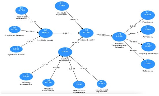 After predictive relevance and coefficient of determination, another criterion of evaluating a model is the assessment of effect size. In addition to the change in R2 when a specific independent variable is omitted from a model, it measures whether this construct has a substantive impact on the dependent variable. This measurement calls f2 the effect size and is increasingly encouraged by researchers []. An effect size less than 0.02 indicates no effects. An effect size from 0.02 to 0.14 is considered weak, from 0.15 to 0.34 is considered moderate, and from 0.35 or more is considered strong []. In this study, the effect size of institute experience on student loyalty is 0.095, which indicates the effect of the exogeneous variable. Effect size of institute image on student loyalty is 0.155, which indicates the effect of institute image, whereas the effect size of institute awareness on student loyalty is 0.00, which indicates it does not have an effect. The effect size of student loyalty to student volunteering behavior is 0.800, which shows the effects of the variables. The structural model is defined as follows in Table 3.