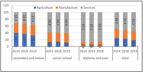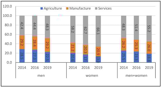 The result of the multinomial logistic analysis shows the probability of women working in manufacturing is 1.161 times that of men. This condition corresponds to the fact that the manufacturing industry is highly dependent on women. The need for female workers in the manufacturing sector is high because women demonstrate high performance with regard to productivity. Although female workers often earn lower wages than men, the trend for women to work in the manufacturing industry is driven by economic motives to meet their own family and individual needs [50]. In the meantime, the proportion of female workers in the agricultural sector in the period of 2014–2019 remained smaller than that of men. In 2019, 13.0% of the total female workforce was in the agricultural sector, was a decrease compared to 2014 (20.6%). Most of the workers who left the agricultural sector joined the services sector, while the manufacturing sector tended to remain steady. On the other hand, of the total male workforce, 22.5% were employed in the agricultural sector which was a decrease compared to 2014 (Figure 3).