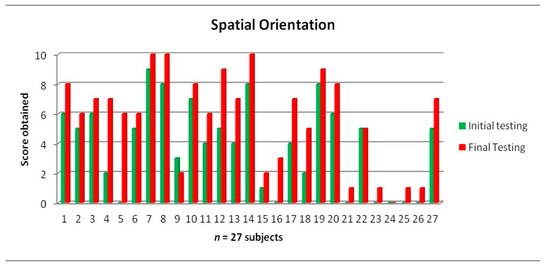 The data obtained at the initial test show that students have problems with spatial orientation (seven subjects obtained a score of 0 points). Following the applied program, only one child did not make progress; he had a complex diagnosis and his comprehension was quite low. The subjects also obtained low scores in spatial orientation, although there is an improvement in the final results.