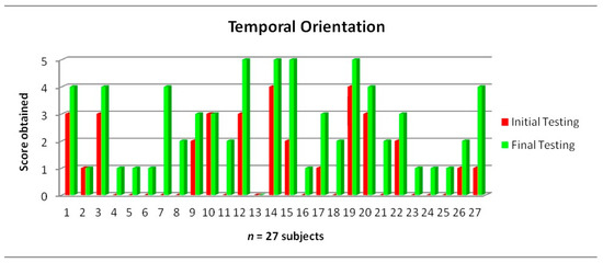 Regarding the psychomotor component–temporal orientation, the results registered an increase between the initial and the final test (Table 5, Figure 2).