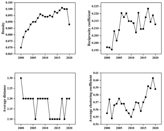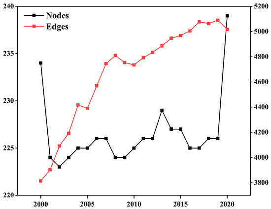 Figure 2). On the one hand, the nodes in the network have increased by 31.54%; on the other hand, the edges have increased by 2.14%. This means that the growth rate of edges is higher than that of nodes. Interestingly, the number of nodes declined rapidly in 2000 and rose rapidly in 2020. The World Dairy Situation 2001 Report indicates that global milk production is expected to be 579 million tons in 2001, a slowdown from 574 million tons in 2000 and 567 million tons in 1999. The decrease in the number of nodes in 2000 may be due to a reduction in the supply of milk production. As for 2020, the global spread of COVID-19 has caused a significant increase in demand for milk worldwide. As demand for dairy products has rebounded from its low point in early 2020, overall dairy prices are gradually stabilizing, and global dairy trade is gradually recovering. The rapid growth of nodes and edges indicates that the range of countries engaged in the global dairy trade is inflating, whereas the interdependence of countries is deepening. Therefore, the trade relationships tend to be complex.