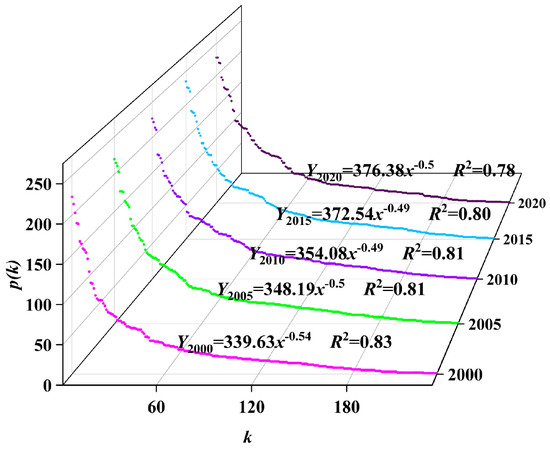 Figure 4) as per the comparison of the node degree distribution curves in 2000, 2005, 2010, 2015, and 2020. The number of nodes with small node degrees is high, whereas the number of hub nodes with large node degrees is low. The node degrees of the five years are further fitted with power functions, and all of the node degrees have passed the significance test. This means that the node degree distribution obeys the power law distribution. Furthermore, there is evident heterogeneity among the nodes, which satisfies the characteristics of the scale-free network. Finally, the power law index of the fitted equation displays an overall increasing trend from 2000 to 2020. This shows that the scale-free nature of the global dairy trade network has increased from 2000 to 2020.