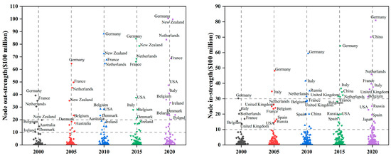 Figure 6. This shows a persistent expansion in the value of the global dairy trade and an improvement in the trade position of the countries. On the one hand, the top-ranked countries are relatively fixed for node out-strength, with France, Germany, New Zealand, the Netherlands, and Belgium occupying the top 10 year-round. These countries have dominated the global dairy export market for a long period. Furthermore, there is also a rise in the rankings from the USA and Italy.