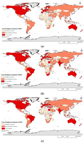 (3) In the context of core–periphery structure, such as the trend of economic globalization, there is a significant increase in the core–periphery countries. In contrast, the semi-periphery countries have decreased over time. Moreover, countries such as the U.S., Canada, and France perennially occupy the core position. Alternatively, states such as Indonesia and Malaysia represent the newly emerging core countries.