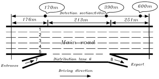 The US-101 data contain 25 attributes: vehicle ID, frame ID, global time, local X, and local Y, etc. [49]. The length of the study area is about 640 m, including eight lanes, five driving lanes, two ramp lanes, and one merging lane, shown in Figure 1. The dataset contains 45 min of US-101 vehicle trajectories divided into three 15-min periods: 7:50 a.m.–8:05 a.m., 8:05 a.m.–8:20 a.m., and 8:20 a.m.–8:35 a.m. The trajectory data from 7:50 a.m.–8:05 a.m. was used in this study.