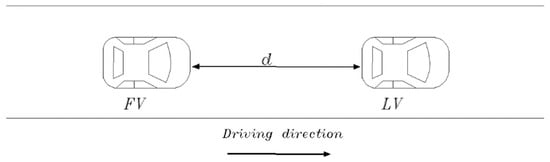 The car-following process is mainly expressed in the process of the following vehicle (FV) to the driving state of the leading vehicle (LV). Figure 2 shows the following scenario. In the same lane, the driver of the following vehicle adjusts the driving speed of his vehicle in real-time according to the driving behavior of the previous vehicle to maintain the desired distance; d is the workshop distance between the two vehicles.