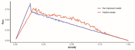 When the density of the two models is in the range of 0.143 to 0.805, the NaSch model traffic flow is slightly larger than the improved CA model. This is because the improved model considers the speed adaptation principle. When the distance between the preceding and following two vehicles is less than the synchronization distance, as well as the slower speed of the front vehicle, the following vehicle will choose to slow down to ensure a safe distance, while the NaSch model only considers whether the distance between the preceding and the following two cars can guarantee that the following car will not collide with the preceding car in the next time step. So, in this density, the average speed of the NaSch model will be slightly larger than the improved CA model’s, resulting in a slightly higher density. However, as the density gradually increases, the gap between the two models becomes smaller and eventually converges.