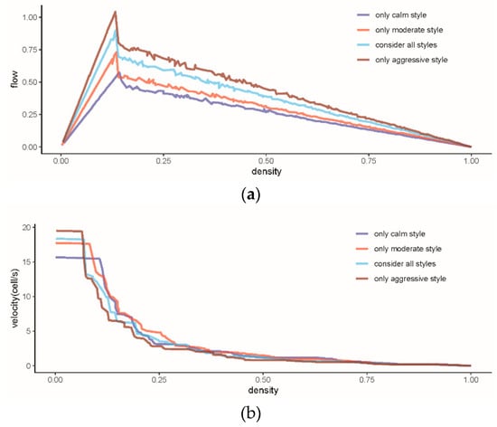 Fundamental diagram. (a) Averaged flow-density diagram for different styles and (b) velocity-density diagram for different styles. (Source: Own elaboration).