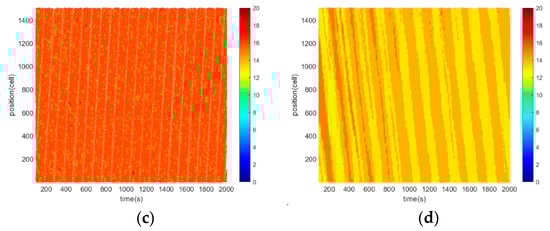 Thermodynamic diagrams are created based on the speed of vehicles on the road. In this experiment, the vehicle speed is divided into 20 levels from 0 to 20, where red is the maximum speed of 20 cells/s and blue is the stationary state, 0 cells/s. The diagrams’ abscissa indicates the cell’s location, while the ordinate indicates the simulation time. The driving direction is from left to right, and the time moves in the direction from bottom to top. The spatio-time region consisting of spatial location 0–2000 cells and simulation time 1000–2000 s is selected for thermodynamic diagrams analysis.