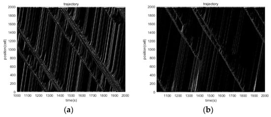 Figure 8a,b represents the trajectory diagrams of the NaSch model and the improved CA model considering a density of 0.42, respectively. The diagrams’ abscissa indicates the spatial location of the cell, and the ordinate indicates the simulation time. The most representative spatial locations 0–2000 cell and simulation times 1000–2000 s are selected to form the trajectory diagrams. The white area in the graph indicates no vehicle at that location, and the black lines indicate the vehicles’ driving trajectory. The vehicles travel from bottom to top, and the time goes from left to right.