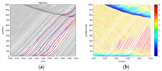 The F-S-J transition fragment is selected further to investigate the speed perturbation under different traffic phases and justify the speed adaptation principle. The trajectory and speed of individual vehicles are analyzed as follows. The trajectory fragment in Figure 9a, the blue and red trajectories indicate the aggressive and the calm cars, respectively. The thermodynamic diagram shown in Figure 9b indicates the vehicle’s current speed.