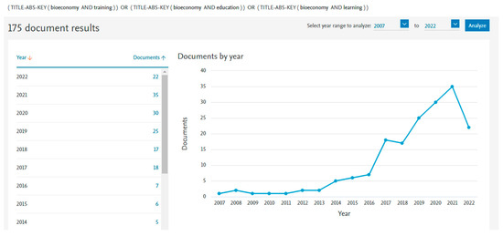 This study conducts a review of the current practices of bioeconomy education and training. Data was collected from a range of sources including peer-reviewed publications, reports, results from previous projects, national policies. Our search strategy followed a number of key steps: on the one hand, all partners of the RELIEF consortium were asked to participate in the data collection process by providing relevant information and data on educational approaches in their respective countries as well as the EU. On the other hand, relevant studies were identified through key word searches through google scholar and SCOPUS and desk-based research. Keywords used in these searches included ‘bioeconomy education’, ‘bioeconomy training’, and ‘bioeconomy learning’, these searches identified a total of 259 publications (175 in Scopus). The publications identified show considerable increase in recent years until October 2022 (Figure 2).