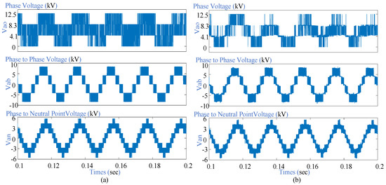 Figure 6 displays the FC voltages in the case of steady-state references of load currents. It can be observed from the simulation result that FCs voltages are regulated at the level of of for both controllers. Output phase voltages Vao, phase to phase voltages Vab, and phase to neutral point voltages Van are shown in Figure 7 in steady-state conditions.