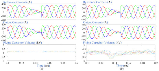 The transient-state analysis is carried out using step change in the reference current from to at 50 Hz with balanced loads ) and sampling time . The step change in signal is applied during the interval of to . Simulation results of load currents and FC voltages are shown in Figure 8 for both controllers. It can be observed that output load currents follow their references well during step change and FCs voltages are also regulated to an acceptable range during transitions. Further analysis is described in Section 5.4.