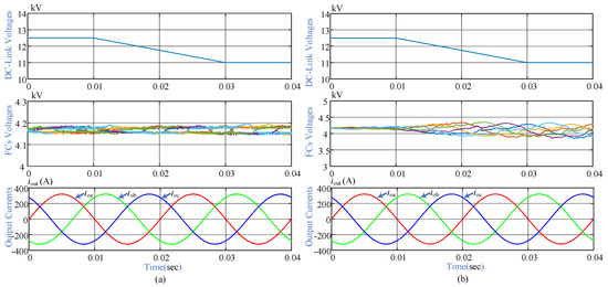 Ramp alteration in DC link voltage is analyzed for the following parameters: DC link falling ramp change from 12.5 kV to 11 kV, balanced reference currents at 50 Hz), balanced loads (), and sampling time . Falling ramp change in DC link voltages is applied during the interval of to . Simulation results of load currents, DC link voltages, and FCs voltages during the transition state are is given in Figure 10 for both controllers. It can be seen that load current keeps tracking its references at an acceptable level while falling ramp change in DC link voltages and FCs voltages are also regulated to an acceptable range during the transition period. Further analysis is described in Section 5.4.