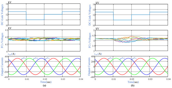 Step alteration in DC link voltage is analyzed using these parameters: DC link step changes 12.5 KV to 11 KV from time to , 11 kV to 12 kV from time to and 12.5 KV from , balanced reference currents at 50 Hz, balanced loads (), and sampling time . Simulation results of load currents, DC link voltages, and FCs voltages during the transition state are given in Figure 11 for both controllers. It can be seen that load current keeps tracking its references at an acceptable level while step change in DC Link voltages and FCs voltages are also regulated to an acceptable range during the transition period.