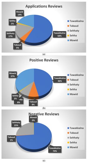 Figure 2 presents statistics related to the users’ reviews of Tawakkalna, Tabaud, Sehhaty, Sehha, and Mawid. Panel (a) summarizes the total reviews collected from all the apps and shows that the highest number of reviews was received by the Tawakkalna app. The Mawid app received the highest percentage of positive reviews, as shown in panel (b), while the Sehhaty app received the highest percentage of negative reviews, as shown in panel (c).