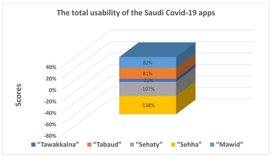 Figure 3 shows the total usability of the five m-health apps. The chart shows that Tabaud and Mawid received positive usability scores, and Tawakkalna is in third place, as it has significantly more reviews than the other apps (see Table 2).