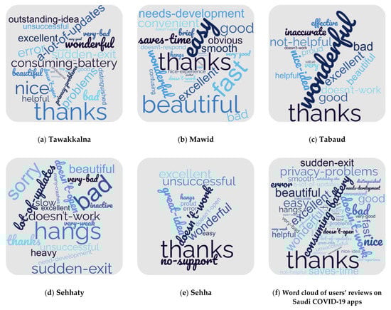 Figure 4 presents the word clouds of the user reviews for each selected app separately and together. The original reviews were a mixture of Arabic and English; the Arabic reviews were translated into English by an Arabic native speaker. The word cloud was generated based on the number of occurrences of specific words in the text. In a word cloud, the most frequent word is represented in the largest size; however, the color coding does not mean anything. Figure 3 and Figure 4 help us evaluate the user experience of COVID-19 apps based on the user review data.