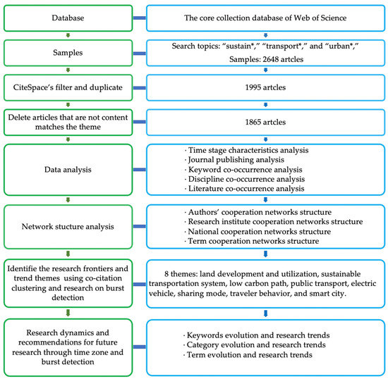 On the basis of graph theory, Professor Chen Chaomei developed a topic co-citation network using the CiteSpace tool, and constructed literature co-citation, journal co-citation, and author co-citation networks. These co-citation networks can detect the most influential literature, journals, and authors [21,22]. Therefore, this research process was designed as follows: First, after downloading all the literature data, this research was to ensure that all the analyzed data are machine-readable by manually checking whether there are garbled codes in the data or not. Thereafter, this research conducted a network analysis and presented the number of published papers in the related fields, time stage characteristics, journal publishing, keyword co-occurrence, discipline co-occurrence, and literature co-occurrence. Second, this research analyzed the authors’ cooperation, research institute cooperation, national cooperation, and term cooperation networks. Lastly, using co-citation clustering and research on burst detection, this research identified the research frontiers and trend themes from 1991 to 30 September 2022. Moreover, the study also demonstrated the research progress in this field from the perspectives of multiple themes, such as land development and utilization, sustainable transportation systems, low-carbon paths, public transport, electric vehicles, sharing modes, traveler behavior, and smart cities. Figure 1 presents the methodological research design.