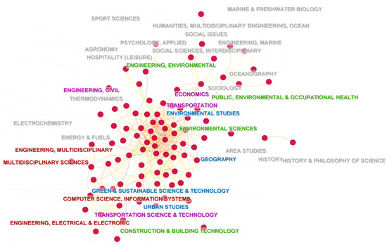 The number of publications in this stage gradually increased, thereby showing that scholars were gradually focusing on urban sustainable transportation. Accordingly, scholars focused on social determination, carbon dioxide emissions, economic restructuring, road traffic, environmental protection, urban transport demand, land use, global urbanization and impact on health, the potential importance of hydrogen, and light rail transit systems [8,26,27,28,29,30,31]. The categories mainly involve environmental sciences, urban studies, transportation sciences, economics, social sciences, computer sciences, mathematics, geography, engineering, biology, meteorology and atmospheric sciences, architecture, medicine, physics, electrochemistry, ecology, and other fields.