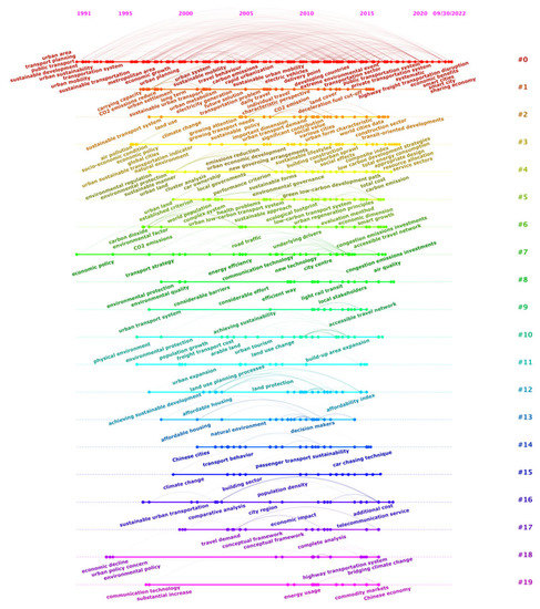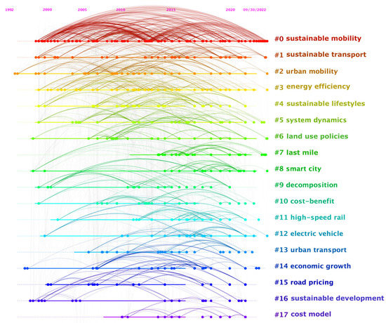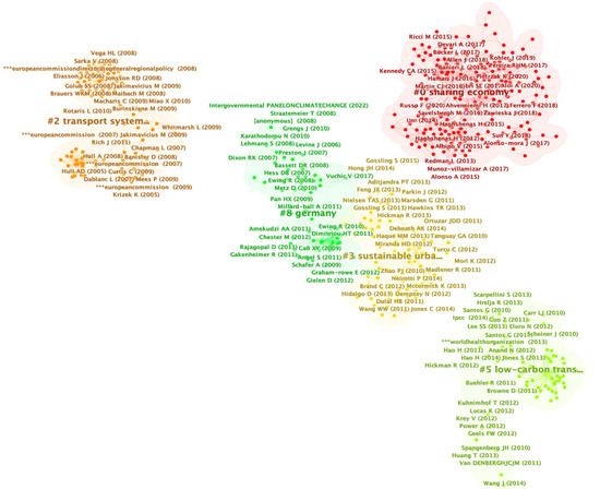Figure 12 presents the term co-citation network, which has clusters from #0 to #88. The top-ranked item by citation count is sustainable development, with a citation count of 320. This item is followed by urban area, 240; public transport, 149; sustainable transport/transportation, 138; economic growth, 121; economic development and environment impact/impacts, both with 115; sustainable mobility, 106; transport/transportation system, 104; smart city/cities, 98; and climate change, 92. The others are urban planning, urban mobility, CO2 emissions, environmental sustainability, land use, electric vehicle/vehicles, travel behavior, transport sector, carbon emissions, energy consumption, air pollution, sharing economy, traffic congestion, urban transport/transportation, etc.