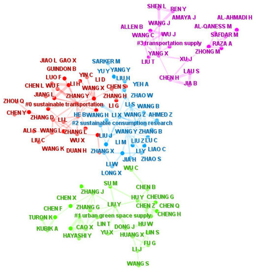 Collaboration between authors in the academic field is equally important for research. To analyze the productivity and collaboration relationship between authors, this research used CiteSpace to process and visualize data. Figure 8 shows the author cooperation network structure. From 1991 to 30 September 2022, many scholars have established contacts and cooperated in the urban sustainable transportation research. The top-ranked item in the cooperation is Zhang, Y., and the first cooperation time was 2006, with 21 cooperation articles, followed by Wang, Y. (2019), 16; Zhang, L. (2015), 14; Li, Y. (2017), 11; and Liu, Y. (2017), 10. The sixth to tenth are Liu, J. (2019), Wang, Z. (2019), Zhang, J. (2015), Li, X. (1999), and Wang, X. (2018), with 9, 9, 9, 8, and 7 cooperation articles, respectively.