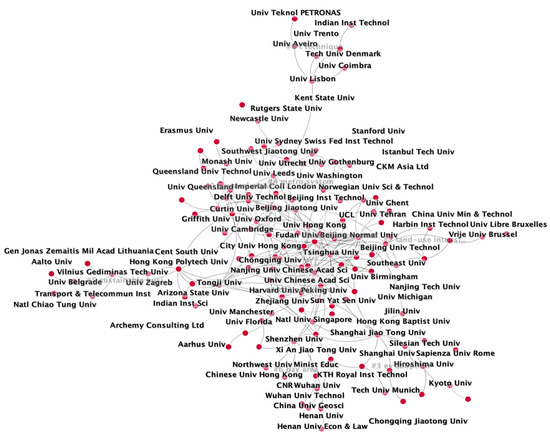 Table 1 shows the top 30 research institutions that cited at least 9 times. The top-ranked item by city counts is the Chinese Acad Sci (2005), with a city count of 49, followed by Tongji Univ (2001), 24; Univ Oxford (2011) and Beijing Jiaotong Univ (2015), both with 23; Beijing Normal Univ (2011), 22; Tsinghua Univ (2015), 19; Univ Leeds (1999) and Curtin Univ (2013), both with 18; Vilnius Gediminas Tech Univ (2009), 16; Univ Hong Kong (1999) and Delft Univ Technol (2012), both with 15; UCL (2000) and Shanghai Jiao Tong Univ (2017), both with 14; and Univ Lisbon (2016), 13. Figure 10 shows the cooperation network of research institutions. Note that the research institutions of these high publications have established close cooperation.