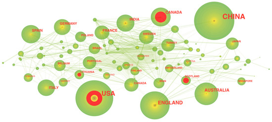 In the national cooperation network, Figure 11 shows that the top-ranked item by cite counts is China (1999), with a cite count of 394. China is followed by the U.S. (1996), 246; England (1998), 162; Australia (1998), 123; Spain (2007), 106; Italy (2006), 102; India (1999), 88; Canada (1997), 75; Germany (1997), 72; and Poland (2013), 68. The top ten countries have stronger international cooperation in relevant fields compared to other countries.
