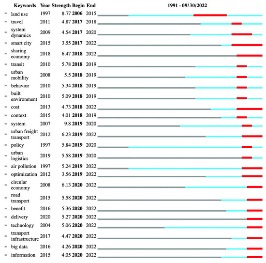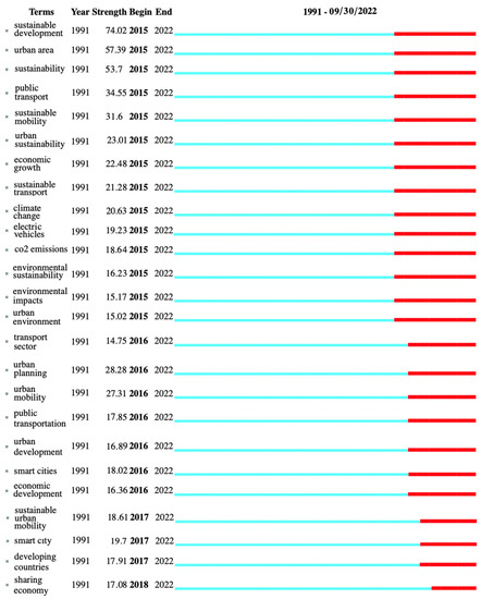Keywords are the concise and accurate summary of the literature theme. The analysis of changes in the literature research topics in a certain field can help potential readers grasp the development of the research field in advance. As shown in Figure 5 and the citation counts, the most popular keywords include city, impact, transport, system, model, sustainable development, land use, public transport, sustainability, policy, CO2 emissions, management, sustainable mobility, sustainable transport, travel behavior, electric vehicle, smart city, growth, climate change, performance, air pollution, sharing economy, economy growth, etc.