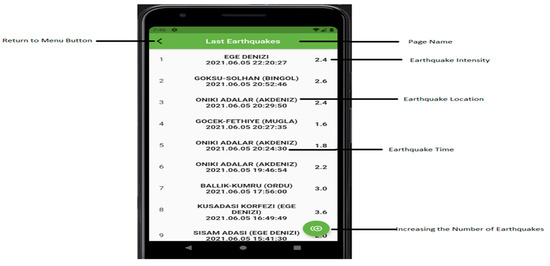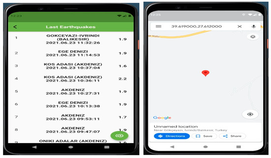 25]. In addition, detailed information about earthquakes is also given in the application. The study allows us to see the time and intensity of the earthquake with instant feedback. Thus, information about the latest earthquakes is obtained by using the Kandilli Observatory data in DepApp. With the created list method, the intensity, time, and location of earthquakes are placed. The location of the earthquake is shown on Google Maps. The Recent Earthquakes page in the application allows users to see the latest earthquakes and obtain information about earthquakes.