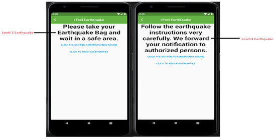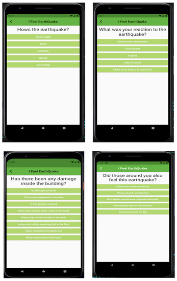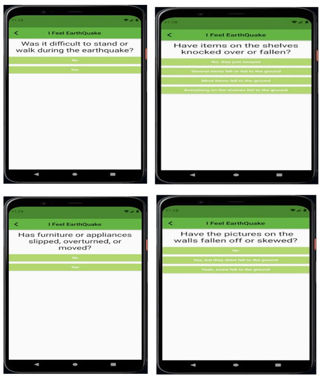 1], an application for user participation was created. The presented crowdsourcing method is also utilized in DepApp. In the project, there was a notification system that was created by volunteers. It was ensured that volunteer participants played an active role in the application. In the DepApp project, a survey form is designed for user participation. With the survey, “I Felt the Earthquake”, the felt intensity of an earthquake can be determined. According to the questions, the choices of an answer are adjusted according to the earthquake intensity. Necessary instructions are presented as a result of an earthquake that was felt less. If the result of the survey determines that the earthquake was felt too much, this situation is reported to the necessary units.