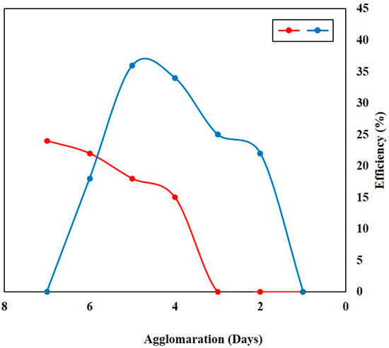 In Equations (2)–(5), is the percentage of the sample, such as 0, 20 and 40 percent, and to are the objective functions for each parameter, respectively. Figure 3a–d depicts the plotted function, given by Equations (2)–(4), respectively. It is mentioned that the value of the squared error for each of the function is equal to one, which shows the complete conformity. The least value obtained for Equation (1) is 0.135 for the sample with 28.5%. For such a sample, the mechanical properties, the day of destroy, agglomeration, and the efficiency will be 27.5, 26.8, 20.5, and 31.5, respectively.