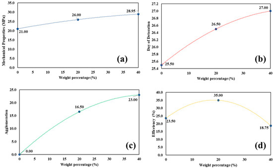The curves of the (a) mechanical properties, (b) day of destroy, (c) agglomeration, and (d) efficiency, based on the weigh percentage variations of the samples.