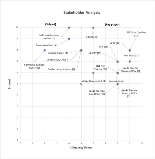 The stakeholder is the institutions, community groups, or individuals who are actively involved directly or indirectly in an activity or initiation; in this case, community-based bamboo development activities as raw materials for the bamboo industry. Stakeholders could have different roles and responsibilities inside or outside the organization, so it is necessary to identify the level of interest and how much power each stakeholder has, with the grouping shown in Figure 3 [20].