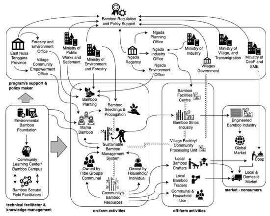 Bamboo is a natural resource with great potential which is yet to be optimally utilized. As a natural resource close to the community, especially for those living in rural areas, bamboo can be a commodity driving the economy of households and rural communities while providing ecological and environmental functions [1,2]. The increasing population, which underpins the rising need for housing and agricultural land, increases suppressing the bamboo cover in rural areas. Bamboo resources are yet to be a priority in their management and utilization. The use of bamboo, in general, and its management challenges in Indonesia still need to be connected between the parties and actors involved. Optimal management and utilization of bamboo require synergy and integration between on-farm and off-farm activities. The connection between surveillance, production, and processing activities supported by strong markets and value chains will drive the sustainable use of community-based bamboo resources [3]. Community-based bamboo development can be a force to boost rural development by advancing the bamboo industry with value-added products, a lesson learned from the success of bamboo development in China [4,5]. In China, smallholder farmers enthusiastically embraced bamboo as a new cash crop and planted it and other non-timber forest crops on their designated forest land instead of less-profitable timber species [6,7,8]. In line with developments upstream, the bamboo processing industry began to grow, so today, the bamboo industry has become a pillar of the rural economy generation of China [9]. In recent years, the development of technology and innovation has changed the use and utilization of bamboo. Bamboo has become a noble material that can be processed into multiple products with various uses. Advanced technology in construction will contribute to the development and expansion of bamboo applications (buildings, structures, bridges, etc.) [10].