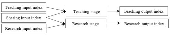 Most DEA models evaluate the efficiency of the input and output of the same kind of decision-making unit (DMU), but in the process of DFCU evaluation, the efficiency of scientific research of each university should be considered, and the efficiency of teaching activities should be considered as well. Therefore, according to the research results of Kuah et al. and Qiao, a joint DEA model is developed to evaluate the CTRE of universities. Its index structure is shown in Figure 1.
