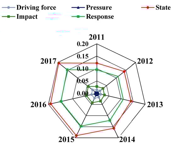 During the research period, the five subsystems of Chongqing’s county education ecological carrying capacity system, namely driving force, pressure, state, influence and response, showed characteristics of steady development (Figure 3). Among them, the pressure subsystem index had the smallest impact on the overall carrying capacity, and its growth rate was the lowest, increasing by 0.003, which indicated that the supply of various educational resources such as manpower, material resources and land needed for the development of Chongqing’s county education was sufficient during the research period. The driving force subsystem index had a relatively high impact on the overall carrying capacity, but the growth rate was relatively small, which indicates that Chongqing had good economic and social security in the development process of educational ecological carrying capacity. The state subsystem index had the biggest impact on the overall carrying capacity with the highest growth rate, rising by 0.074 from 2011 to 2017, which indicates that the situation of educational resources and carrying status in Chongqing county is considerable. The influence subsystem index showed a slow growth trend, with an increase of 0.017 in the past seven years, which indicates that although the improvement of the education carrying capacity in Chongqing’s county has significant economic and social benefits, its benefit potential has not been fully played. The influence of the response subsystem index on the overall bearing capacity was in a secondary position, with a large increase of 0.057 in seven years, which indicates that Chongqing has taken positive measures in aspects of economy, society and resources in the development of the ecological carrying capacity of education.