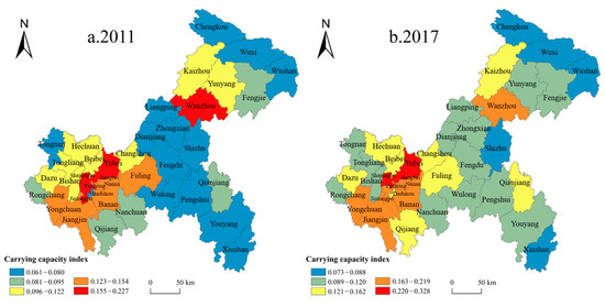 Spatial differentiation pattern of ecological carrying capacity of county education in Chongqing in 2011 to 2017. Note: Based on the standard map (scale 1:48 million) with the approval number of GS (2019) 1823 on the standard map service website, the base map has not been modified.